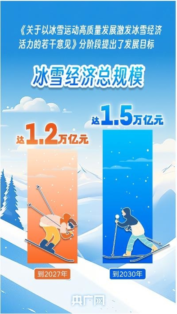 近日,國務(wù)院辦公廳公開發(fā)布《關(guān)于以冰雪運(yùn)動(dòng)高質(zhì)量發(fā)展激發(fā)冰雪經(jīng)濟(jì)活力的若干意見》(以下簡稱《意見》),分階段提出發(fā)展目標(biāo):到2027年,冰雪運(yùn)動(dòng)場地設(shè)施更加完善,服務(wù)水平顯著提升,冰雪運(yùn)動(dòng)更加廣泛開展,冰雪經(jīng)濟(jì)總規(guī)模達(dá)1.2萬億元。到2030年,冰雪經(jīng)濟(jì)主要產(chǎn)業(yè)鏈條實(shí)現(xiàn)高水平協(xié)調(diào)融合發(fā)展,冰雪消費(fèi)成為擴(kuò)大內(nèi)需的重要增長點(diǎn),冰雪經(jīng)濟(jì)總規(guī)模達(dá)1.5萬億元。