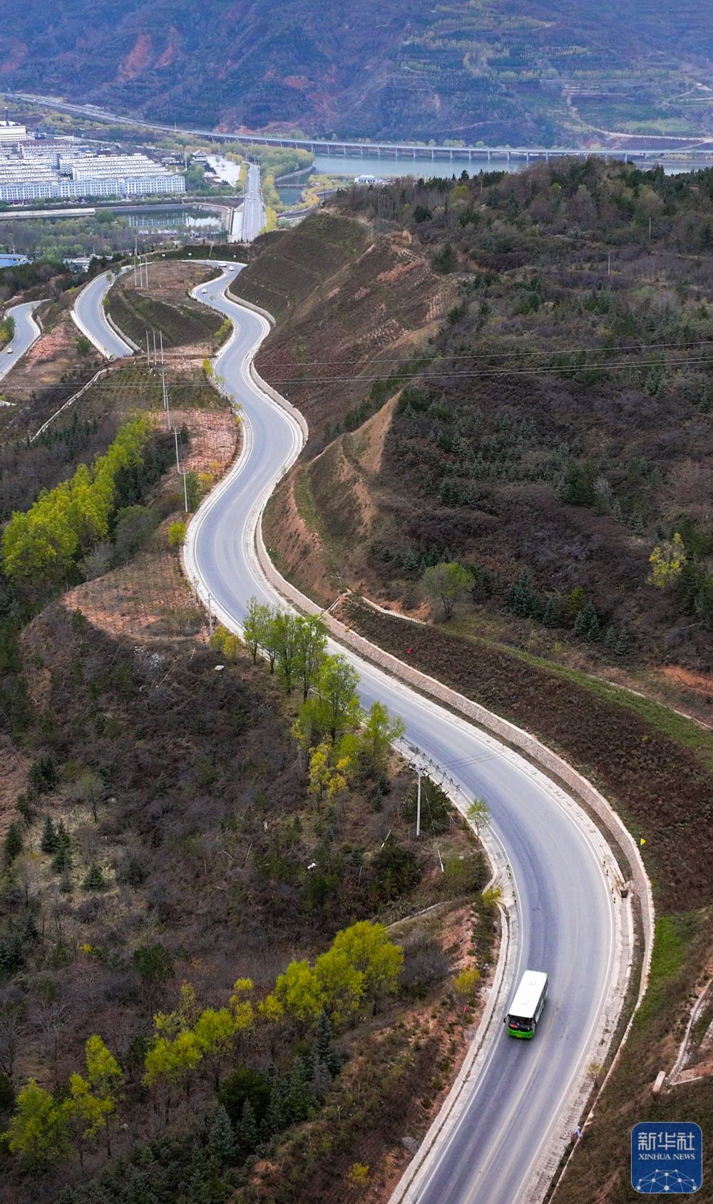 11月9日,一輛載有乘客和快遞物品的公交車從隆德縣城駛出(無人機照片)。