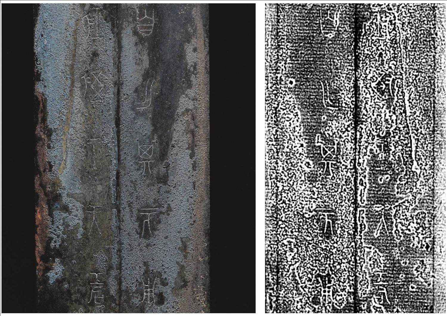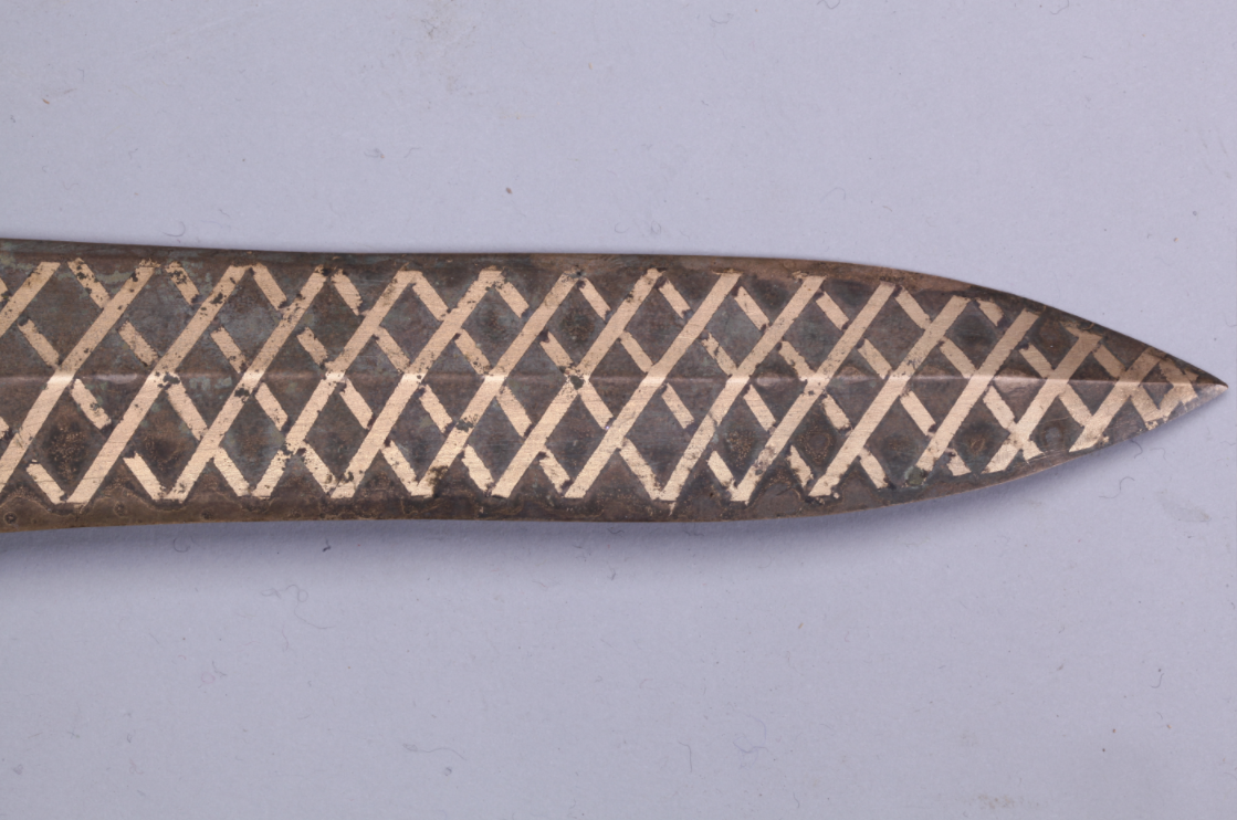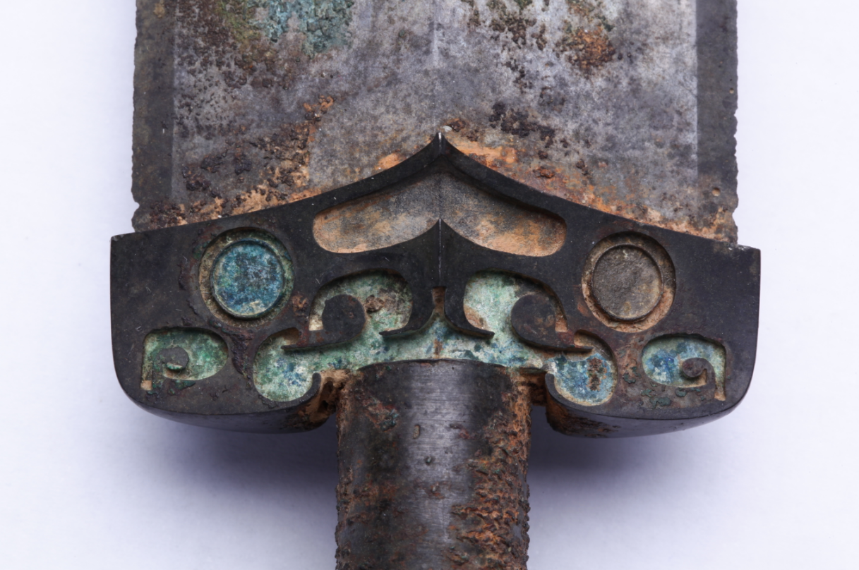 這把青銅劍通長58.3厘米,劍身寬大厚重,在前部有一個明顯變窄,可以提高劍的刺穿能力,劍尖雖然只有極尖銳的一點,但不可思議的是,在高倍放大鏡下仍然可以看出有六至八個截面。劍身雖然光素,仔細(xì)觀察會發(fā)現(xiàn)寶劍通體泛著幽幽的神秘藍(lán)光,劍格上鑄出獸面紋,鑲嵌的綠松石有一面已經(jīng)脫落,劍身近格處鑄有兩行銘文:“攻敔(吳)王夫差自乍(作)其元用”,表明這把劍的擁有者是吳國歷史上大名鼎鼎的吳王夫差。