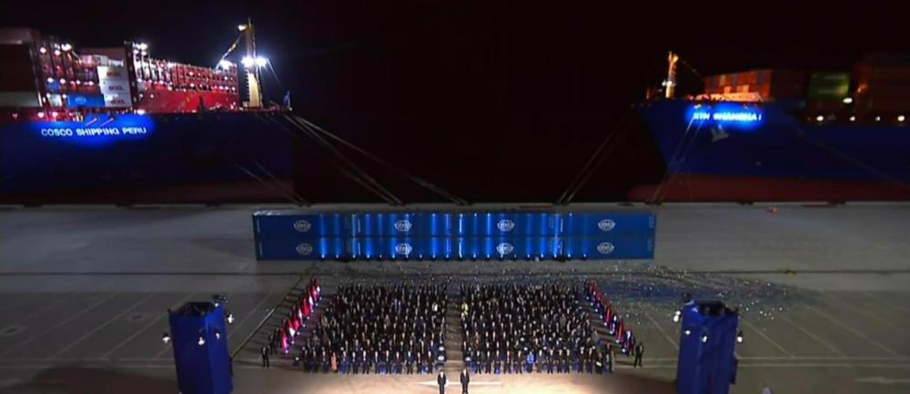 開港儀式現(xiàn)場停泊著兩艘集裝箱輪。其中一艘中遠(yuǎn)“秘魯輪”剛剛抵港,而另一艘“新上海輪”即將離港前往上海。“從錢凱到上?!?,已成為現(xiàn)實。