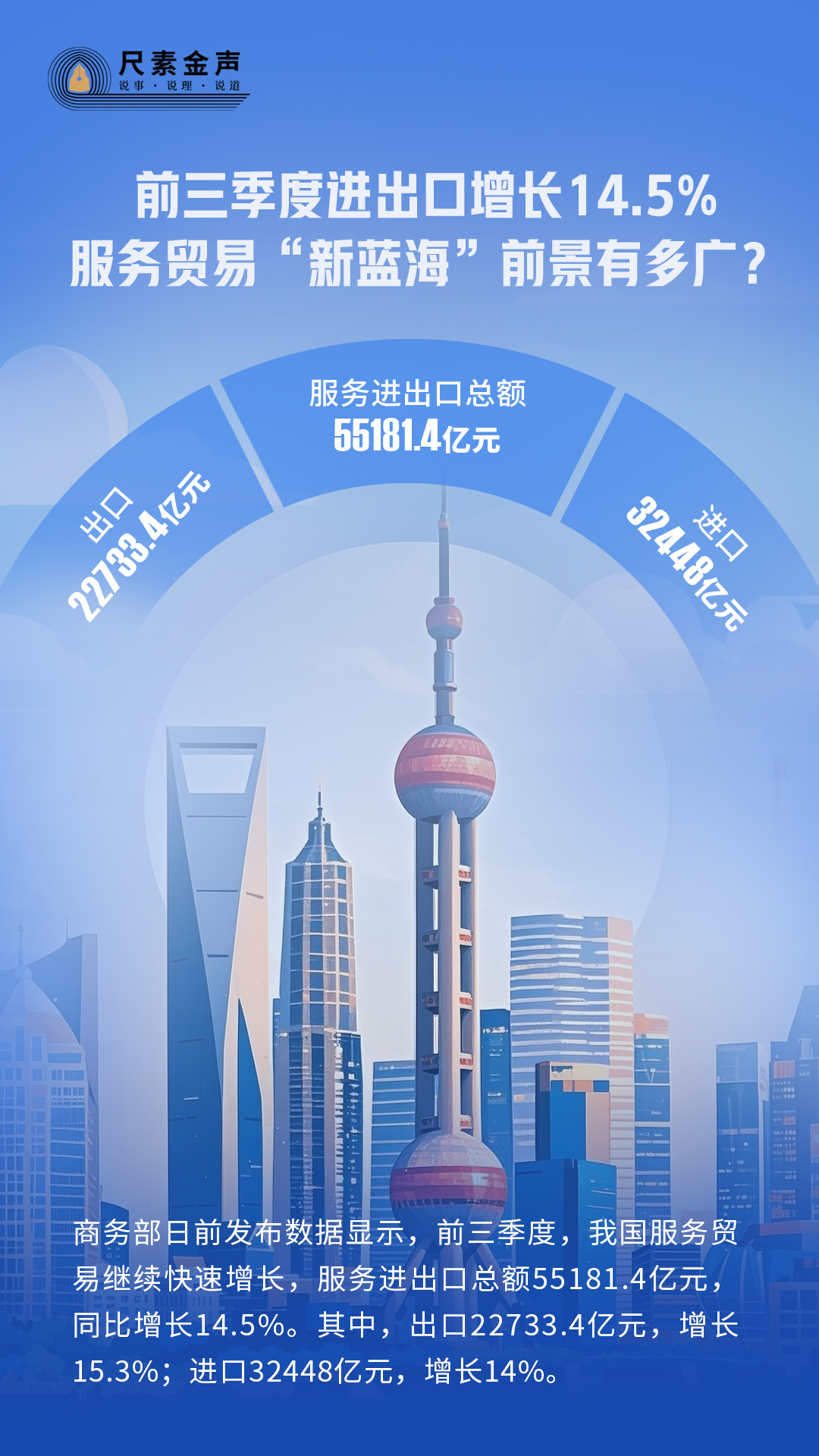 商務(wù)部日前發(fā)布數(shù)據(jù)顯示,前三季度,我國服務(wù)貿(mào)易繼續(xù)快速增長,服務(wù)進(jìn)出口總額55181.4億元,同比增長14.5%。其中,出口22733.4億元,增長15.3%;進(jìn)口32448億元,增長14%。