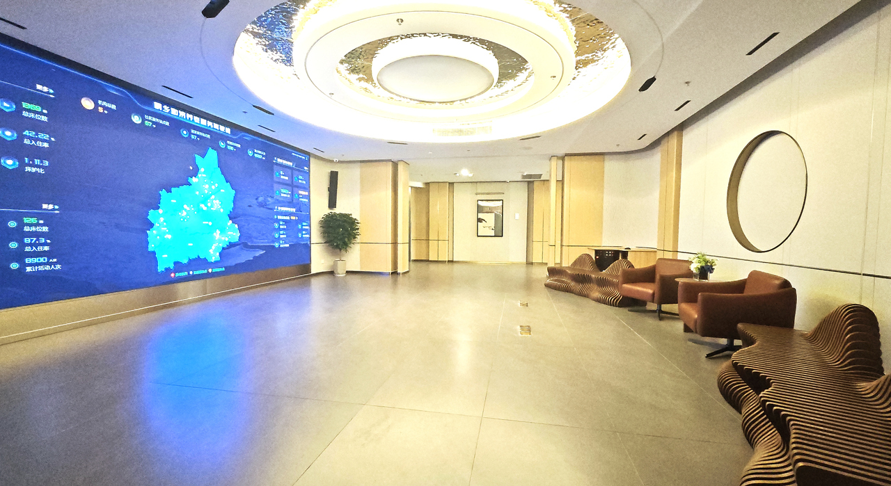進(jìn)入中心,映入眼簾的是占據(jù)整面墻的智能大屏,中心內(nèi)所有公共區(qū)域的實時場景一覽無余。
