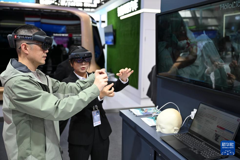 11月19日,在2024年世界互聯(lián)網(wǎng)大會“互聯(lián)網(wǎng)之光”博覽會上,參觀者體驗一款全息智能醫(yī)學(xué)影像系統(tǒng)做手術(shù)的過程。