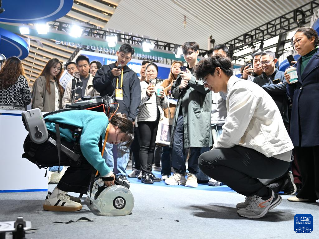 11月19日,在2024年世界互聯(lián)網(wǎng)大會“互聯(lián)網(wǎng)之光”博覽會上,參觀者體驗外骨骼機器人協(xié)助搬運重物。
