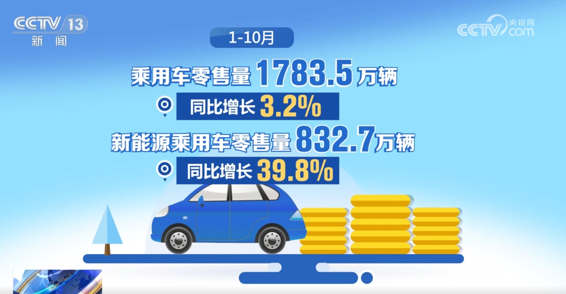 在以舊換新政策的帶動(dòng)下,汽車銷量也有了明顯增長。10月份,乘用車零售量226.1萬輛,同比增長11.3%,增速較9月加快6.8個(gè)百分點(diǎn)。其中,新能源乘用車零售量119.6萬輛,同比增長56.7%,增速較9月加快5.8個(gè)百分點(diǎn),占乘用車零售量的比重達(dá)52.9%。1—10月,乘用車零售量1783.5萬輛,同比增長3.2%。其中,新能源乘用車零售量832.7萬輛,同比增長39.8%。