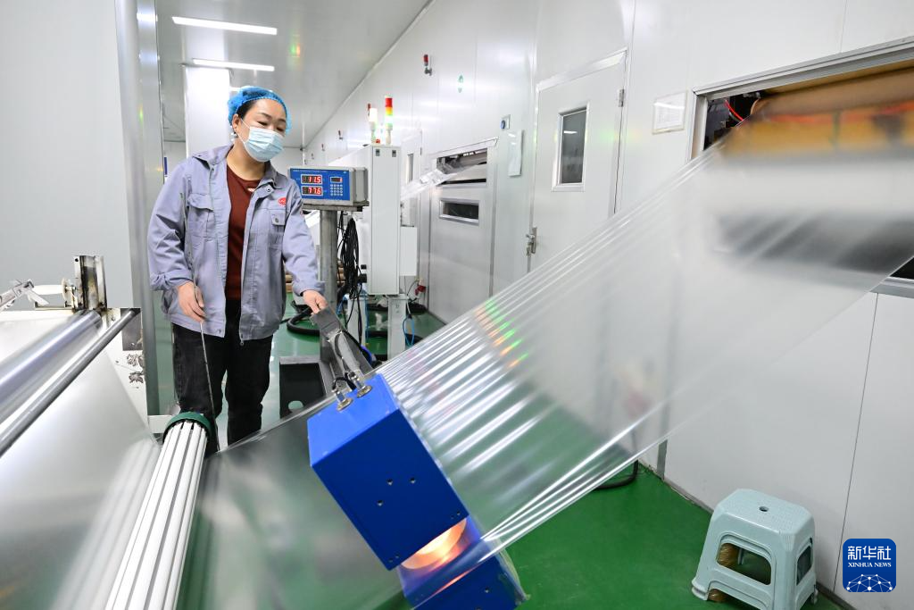 10月24日,工作人員在界首市天鴻新材料股份有限公司的生產(chǎn)車間里工作。新華社記者 周牧 攝