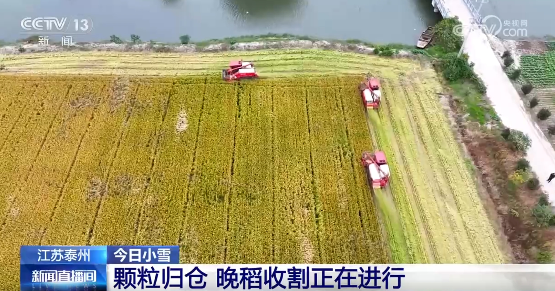 我們現(xiàn)在看到的是江蘇泰州正在進(jìn)行的晚稻收割作業(yè)。這個(gè)時(shí)候,當(dāng)?shù)卦绲竞椭械疽呀?jīng)收獲完成,收割機(jī)正開足馬力進(jìn)行晚稻收獲,割穗、脫粒、粉碎秸稈,一氣呵成,連倒伏的稻穗也被采收干凈,金黃飽滿的稻谷順著管道傾瀉而下,顆粒歸倉。