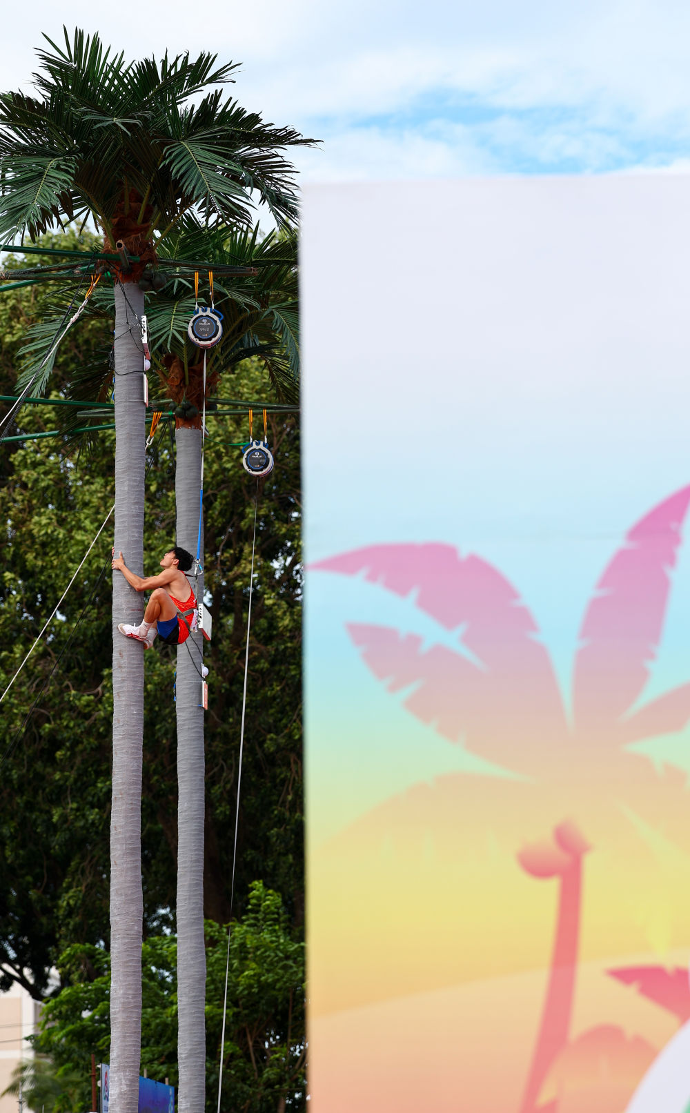 相比在運(yùn)動(dòng)會(huì)上歷史悠久的龍舟,當(dāng)日上演的攀椰競(jìng)速則是在本屆賽事首次撞入人們的眼簾。在椰子樹上手腳并用攀爬,迅速抵達(dá)頂端,不問可知,這一競(jìng)技性與趣味性兼具的運(yùn)動(dòng)脫胎于海南當(dāng)?shù)厝罕妭鹘y(tǒng)的徒手爬樹摘椰子場(chǎng)景。