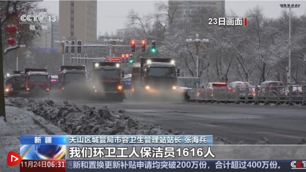 11月22日晚至11月23日,新疆北疆多地出現(xiàn)降雪,其中,烏魯木齊主城區(qū)出現(xiàn)暴雪。多地城管、交通等部門連夜作業(yè)清理積雪、疏導交通,保障道路通暢。