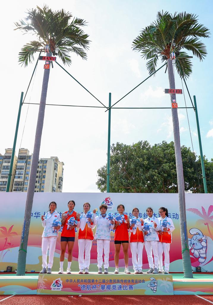 24日,第十二屆全國少數(shù)民族傳統(tǒng)體育運動會攀椰競速比賽結(jié)束爭奪,海南隊的羅軍和符詩軍分獲男子、女子一等獎。