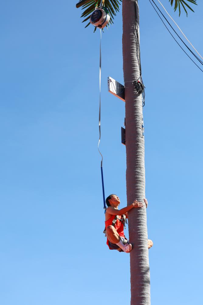 這項起源于海南群眾摘椰勞作的比賽既像沒有巖點的速度攀巖,又像垂直騰躍的跑酷。比賽中,運動員在9米(女子7米)的人造椰樹上攀爬,“樹干”筆直,六七秒之間便已決出勝負,扣人心弦的比賽令觀眾發(fā)出潮水般的歡呼。