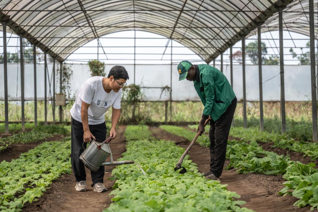 2024年8月3日,在剛果(布)首都布拉柴維爾的中國援剛果(布)農(nóng)業(yè)技術(shù)示范中心內(nèi),中方農(nóng)業(yè)專家李科明(左)與當(dāng)?shù)貑T工在大棚內(nèi)耕作。(新華社記者鄭揚子攝)