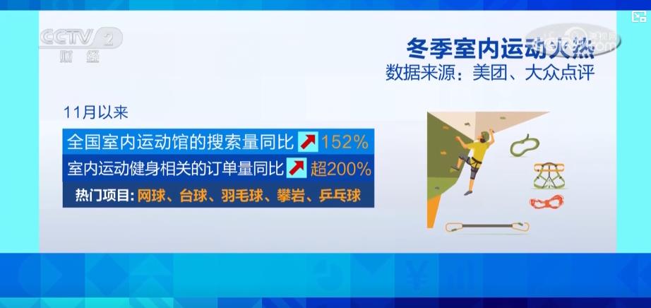 數(shù)據(jù)顯示,11月以來,全國(guó)室內(nèi)運(yùn)動(dòng)館的搜索量同比增長(zhǎng)152%,與室內(nèi)運(yùn)動(dòng)健身相關(guān)的訂單量同比增長(zhǎng)超200%,網(wǎng)球、臺(tái)球、羽毛球、攀巖、乒乓球是其中的熱門項(xiàng)目。