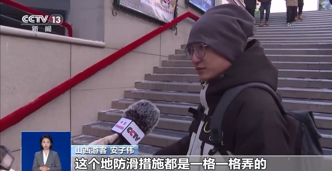 山西游客 安子偉:這個地防滑措施都是一格一格弄的,有橡膠還有鋁合金。扶手也做了一些保暖措施,不管是旅游相關(guān)人員,還是哈爾濱的市民,對我們都很熱情,東北人熱情“嘎嘎的”。