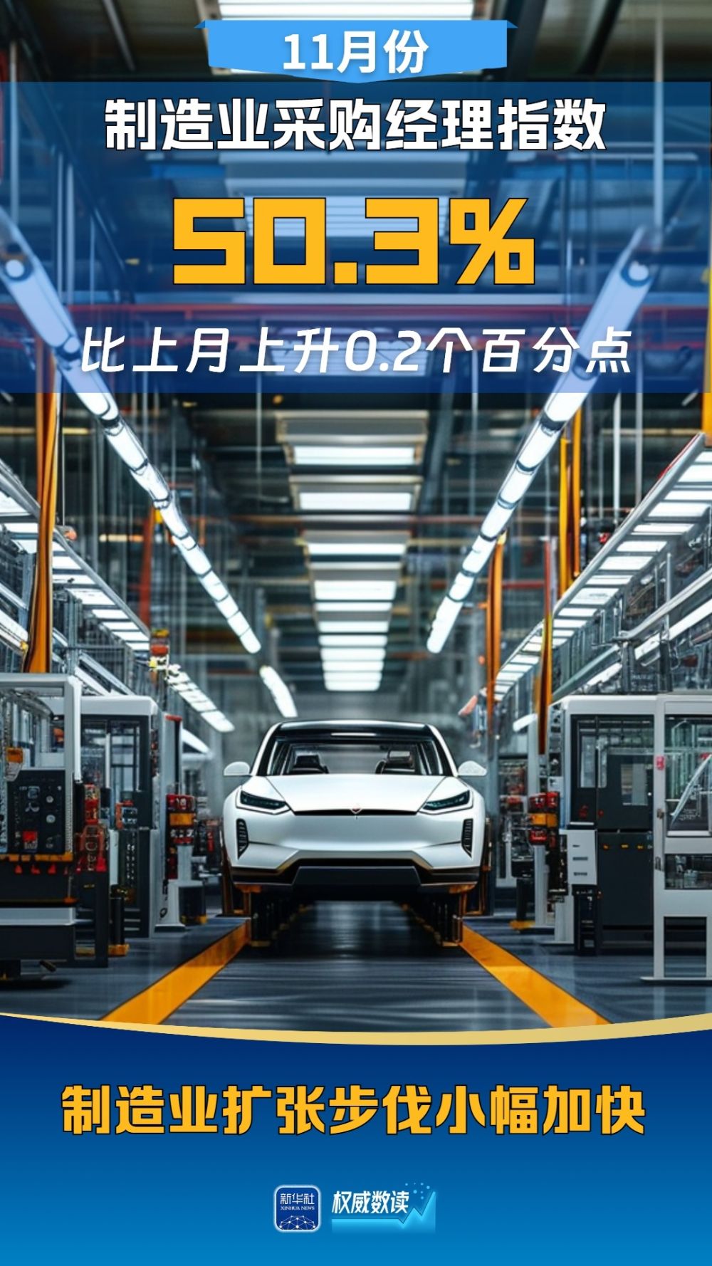 國(guó)家統(tǒng)計(jì)局30日發(fā)布中國(guó)采購經(jīng)理指數(shù)。11月份,隨著一系列存量政策和增量政策持續(xù)協(xié)同發(fā)力,制造業(yè)PMI在景氣區(qū)間上行,升至50.3%,擴(kuò)張步伐有所加快;非制造業(yè)商務(wù)活動(dòng)指數(shù)為50.0%,比上月下降0.2個(gè)百分點(diǎn),位于臨界點(diǎn);綜合PMI產(chǎn)出指數(shù)為50.8%,與上月持平,表明我國(guó)企業(yè)生產(chǎn)經(jīng)營(yíng)活動(dòng)總體繼續(xù)擴(kuò)張。