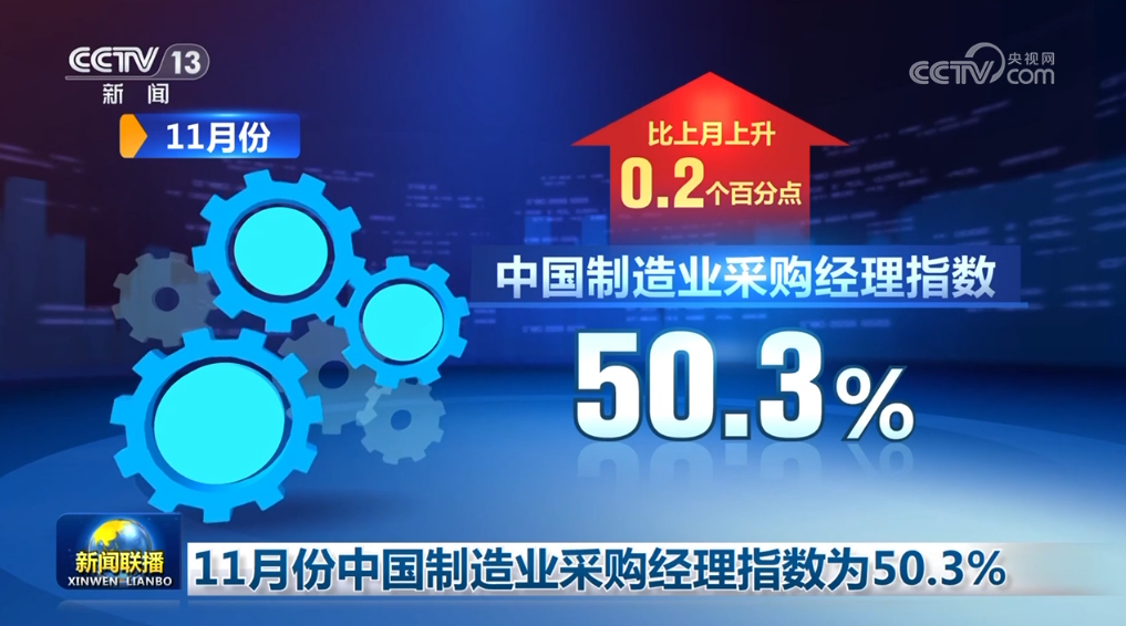 11月份中國制造業(yè)采購經(jīng)理指數(shù)為50.3%,比上月上升0.2個(gè)百分點(diǎn)。