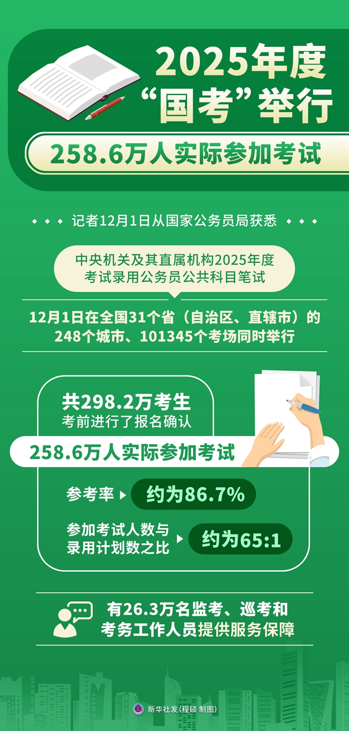 新華社北京12月1日電 記者1日從國家公務(wù)員局獲悉,中央機(jī)關(guān)及其直屬機(jī)構(gòu)2025年度考試錄用公務(wù)員公共科目筆試1日在全國31個?。ㄗ灾螀^(qū)、直轄市)的248個城市、101345個考場同時(shí)舉行,共298.2萬考生考前進(jìn)行了報(bào)名確認(rèn)、258.6萬人實(shí)際參加考試,參考率約為86.7%,參加考試人數(shù)與錄用計(jì)劃數(shù)之比約為65:1,有26.3萬名監(jiān)考、巡考和考務(wù)工作人員提供服務(wù)保障。