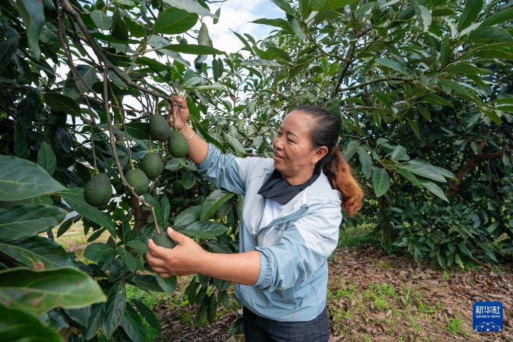 由企業(yè)在當(dāng)?shù)剞r(nóng)民中培訓(xùn)的產(chǎn)業(yè)技術(shù)人員李美瓊在一處牛油果種植基地檢查待采的牛油果(10月29日攝)。新華社記者 陳欣波 攝