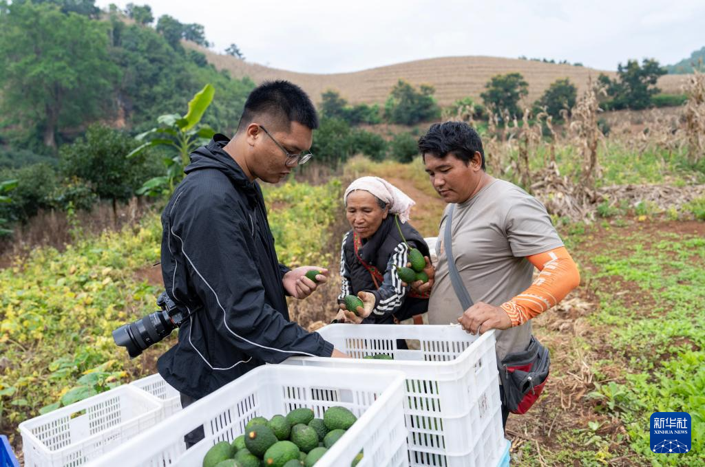 孟連縣“新農(nóng)人”、“牛友果星球”工作室主人李偉(左)在一處牛油果種植基地查看果農(nóng)剛采摘的牛油果(10月29日攝)。新華社記者 陳欣波 攝
