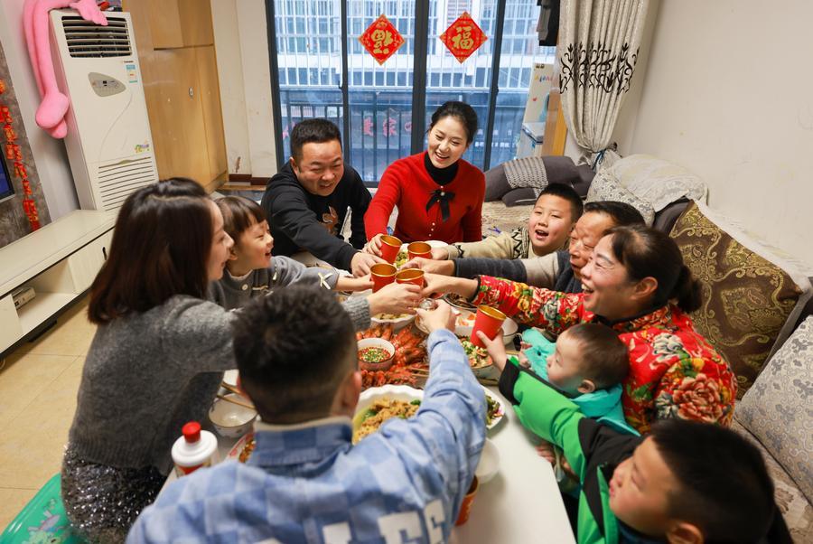 2024年2月9日,貴州省遵義市正安縣一戶(hù)居民在家中吃年夜飯。 新華社發(fā)(趙永章 攝)