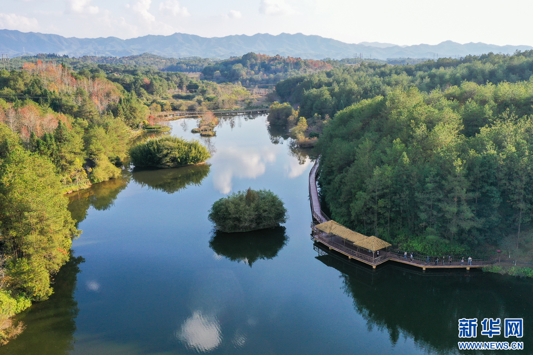 這是長汀汀江國家濕地公園一隅。經(jīng)過30多年的生態(tài)治理,昔日水土流失重災(zāi)區(qū)已成為風(fēng)光秀麗、林果連片的生態(tài)旅游勝地(無人機(jī)照片)。