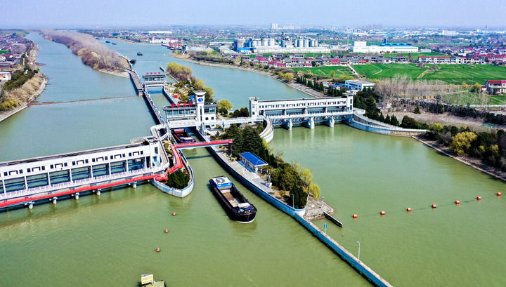 位于江蘇省揚(yáng)州市江都區(qū)的南水北調(diào)東線一期工程運鹽閘、邵仙套閘、邵仙閘洞(2024年3月19日攝,無人機(jī)照片)。新華社發(fā)(任飛攝)