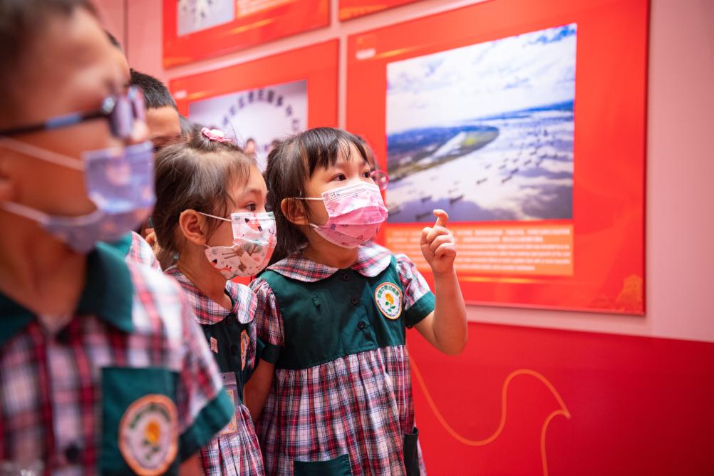 2021年7月12日,小朋友參觀在澳門舉行的“中國(guó)共產(chǎn)黨的100年”大型圖片展。新華社記者 張金加 攝