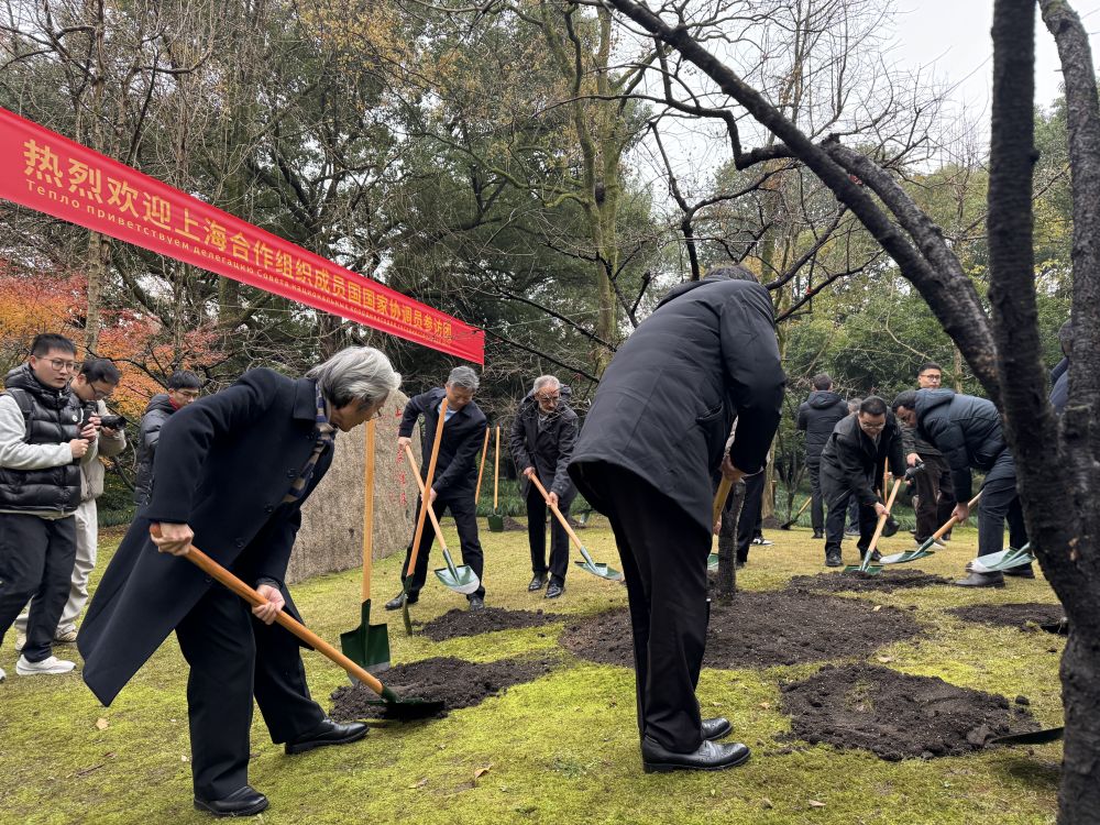 12月13日,上海合作組織成員國國家協(xié)調(diào)員來到西湖邊的“上合友誼林”,共同為象征友誼的美人梅培土。新華社記者 段菁菁 攝