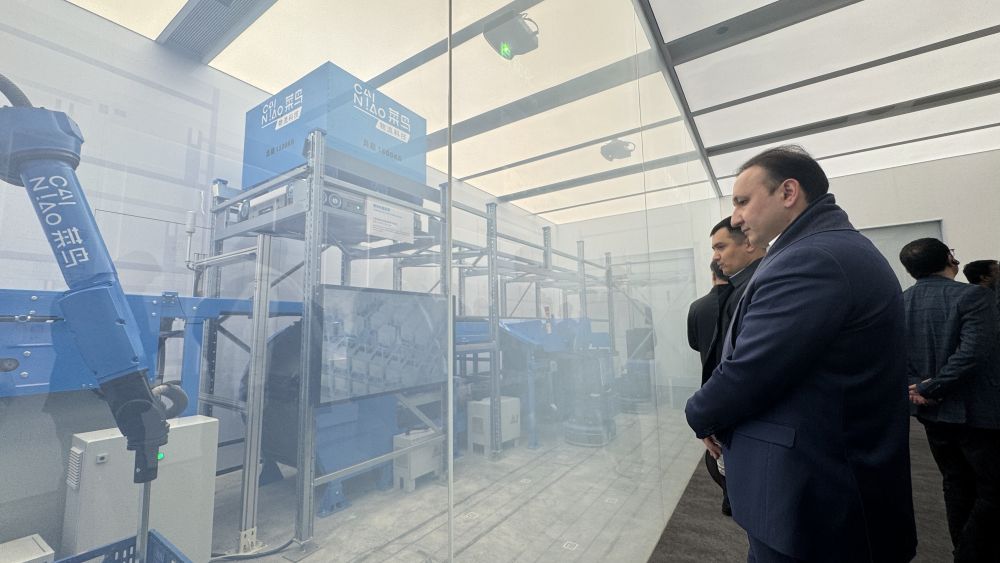 12月13日,協(xié)調(diào)員參觀菜鳥集團(tuán)的智能物流設(shè)備。新華社記者 段菁菁 攝