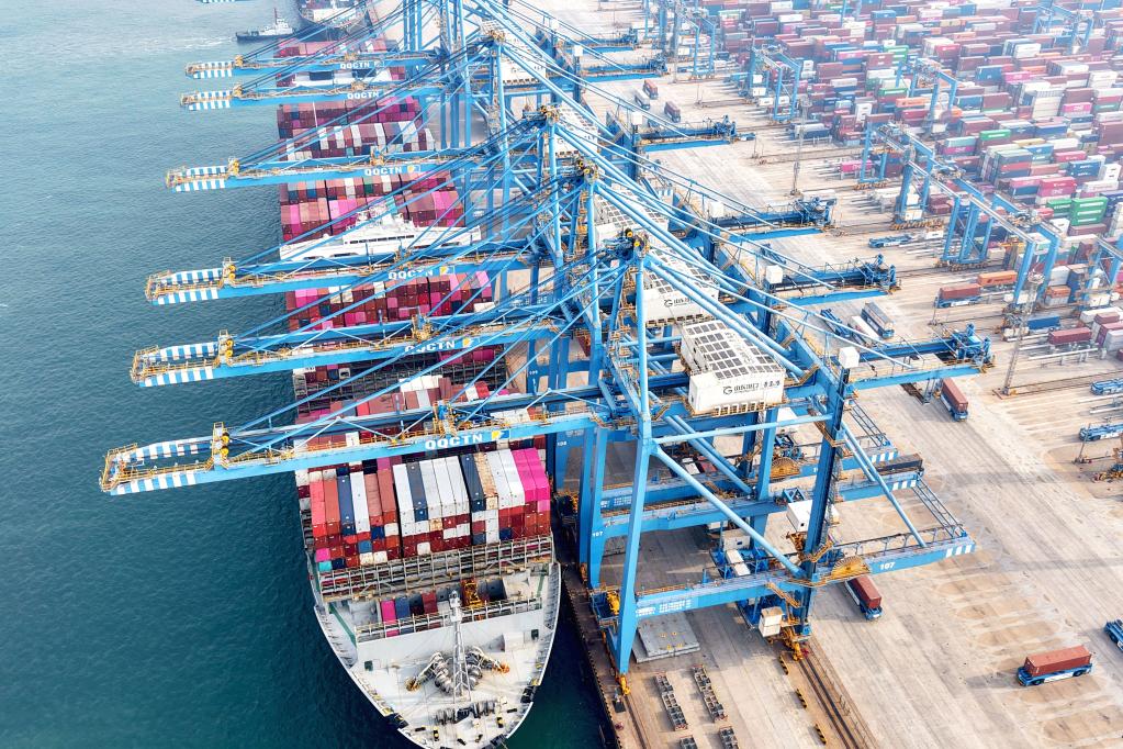 2024年2月10日,在山東港口青島港全自動(dòng)化碼頭,貨輪在裝卸外貿(mào)集裝箱。新華社發(fā)(俞方平攝)