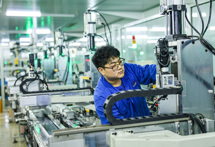 2024年12月12日,在山東省榮成市一家燃?xì)庥?jì)量?jī)x表制造企業(yè)的智能化生產(chǎn)車間內(nèi),維修工人在進(jìn)行設(shè)備調(diào)試。新華社發(fā)(李信君攝)