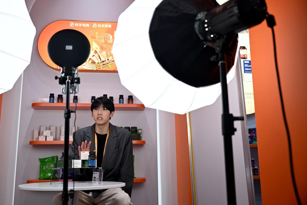 2024年11月5日,快手跨境主播在第七屆進(jìn)博會(huì)服務(wù)貿(mào)易展區(qū)直播。新華社發(fā)(陳浩明攝)