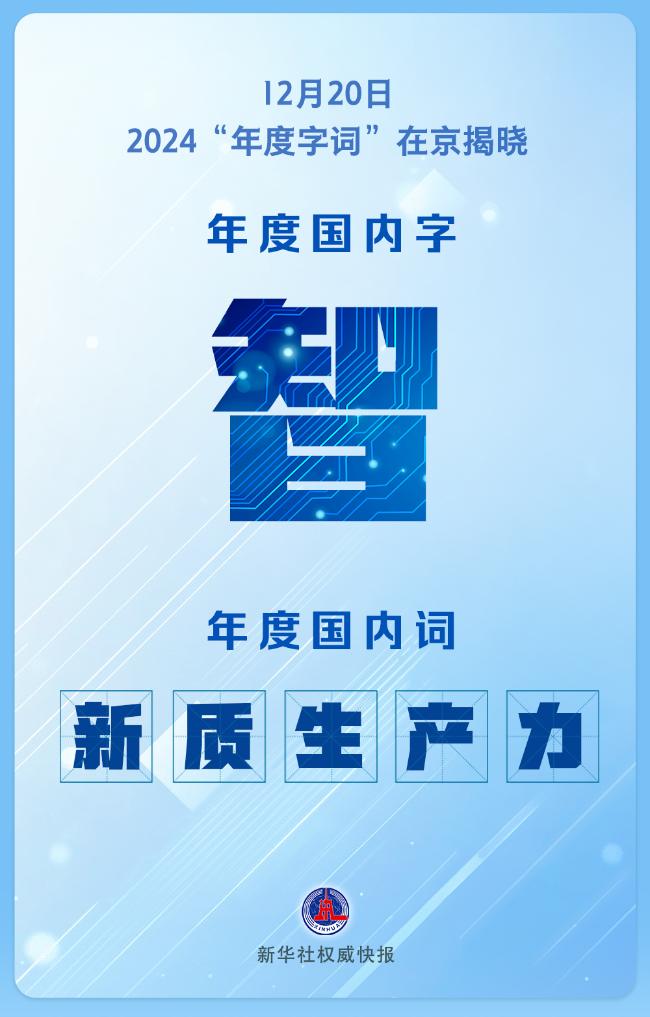12月20日,“漢語盤點(diǎn)2024”活動在京揭曉“年度字詞”——“智”“新質(zhì)生產(chǎn)力”“變”“人工智能”分別當(dāng)選2024年度國內(nèi)字、國內(nèi)詞、國際字、國際詞。
