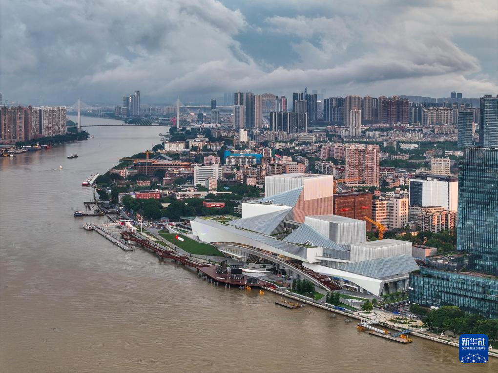 白鵝潭大灣區(qū)藝術(shù)中心宛如“文化巨輪”揚帆珠江(2024年4月27日攝,無人機照片)。