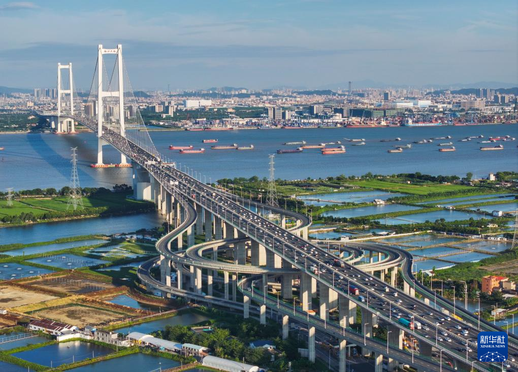 南沙大橋上的車流和獅子洋水道的船舶來來往往(2024年10月2日攝,無人機照片)。
