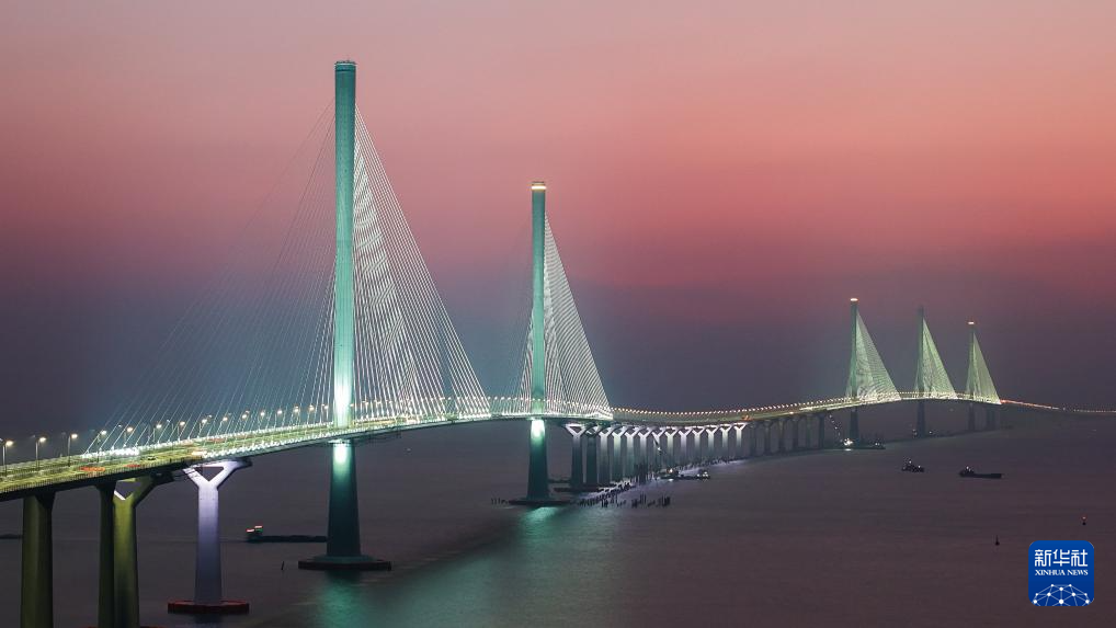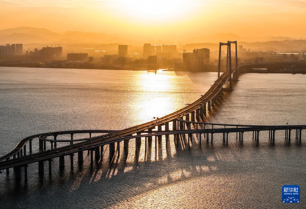 暮色中的黃茅??绾Mǖ栏邫诟鄞髽颍ㄗ髠?cè)雙主塔)和黃茅海大橋(右側(cè)三主塔)(2024年12月7日攝,無人機照片)。
