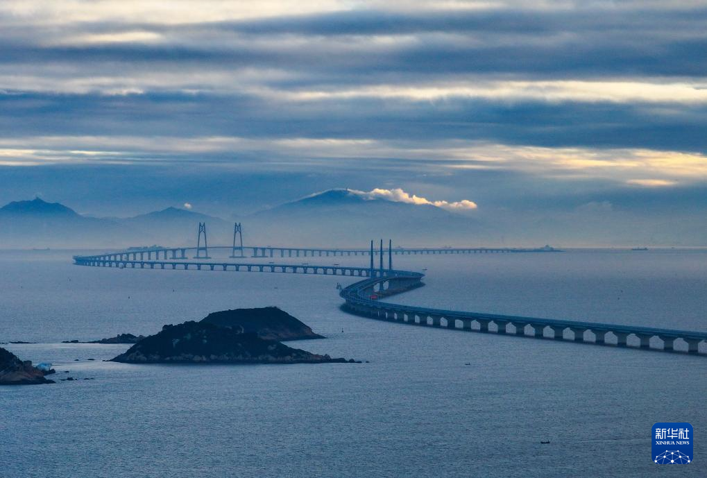 這是晨曦中的港珠澳大橋(2023年12月15日攝,無人機照片)。