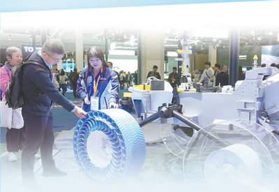 第七屆中國(guó)國(guó)際進(jìn)口博覽會(huì)上,觀眾正在了解米其林月球探測(cè)車(chē)輪胎?!√?克攝