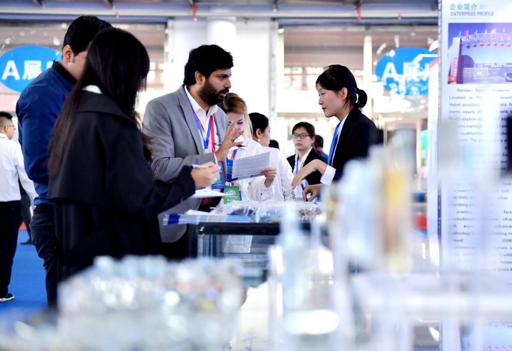 2024年10月10日,采購商(中)在2024年中國(guó)·永年緊固件基地國(guó)際采購大會(huì)現(xiàn)場(chǎng)了解緊固件產(chǎn)品信息。新華社記者 王曉 攝