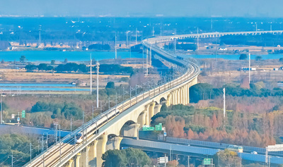 試運(yùn)行列車駛過(guò)滬蘇湖高鐵青浦特大橋金澤橋段。張海峰攝(人民視覺(jué))