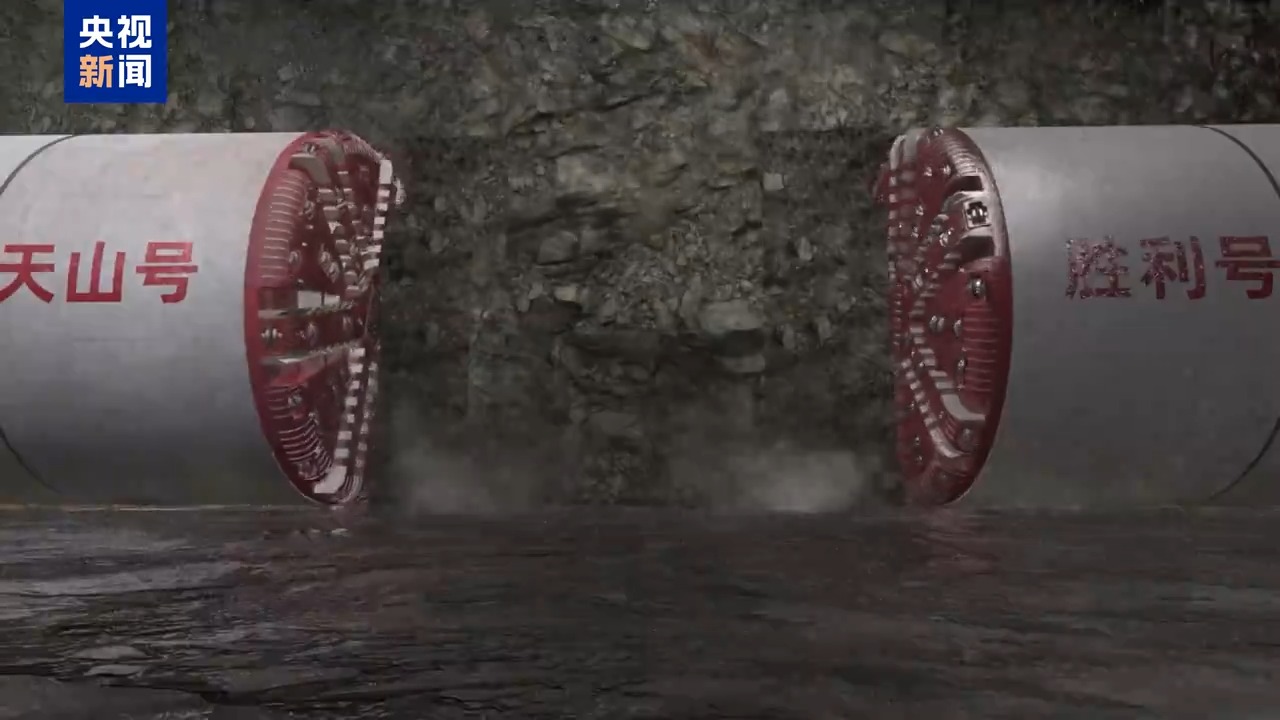 中導(dǎo)洞里,這兩個(gè)分別長283米、刀盤直徑接近3層樓房高、重量約2000噸的鋼鐵“巨無霸”是為中導(dǎo)洞的快速掘進(jìn)專門“量身定制”的利器。名叫“天山號(hào)”和“勝利號(hào)”的兩臺(tái)硬巖掘進(jìn)機(jī)分別從隧道兩端向中間掘進(jìn)。