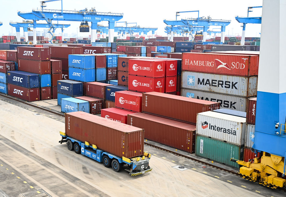 2024年10月20日,在廣西北部灣港欽州港區(qū)碼頭,一輛自動化無人轉運車在運送集裝箱。各式各樣運往東盟各國的貨物在這個海鐵聯(lián)運自動化集裝箱碼頭實現(xiàn)“下船即上車、下車即上船”。新華社記者李賀攝