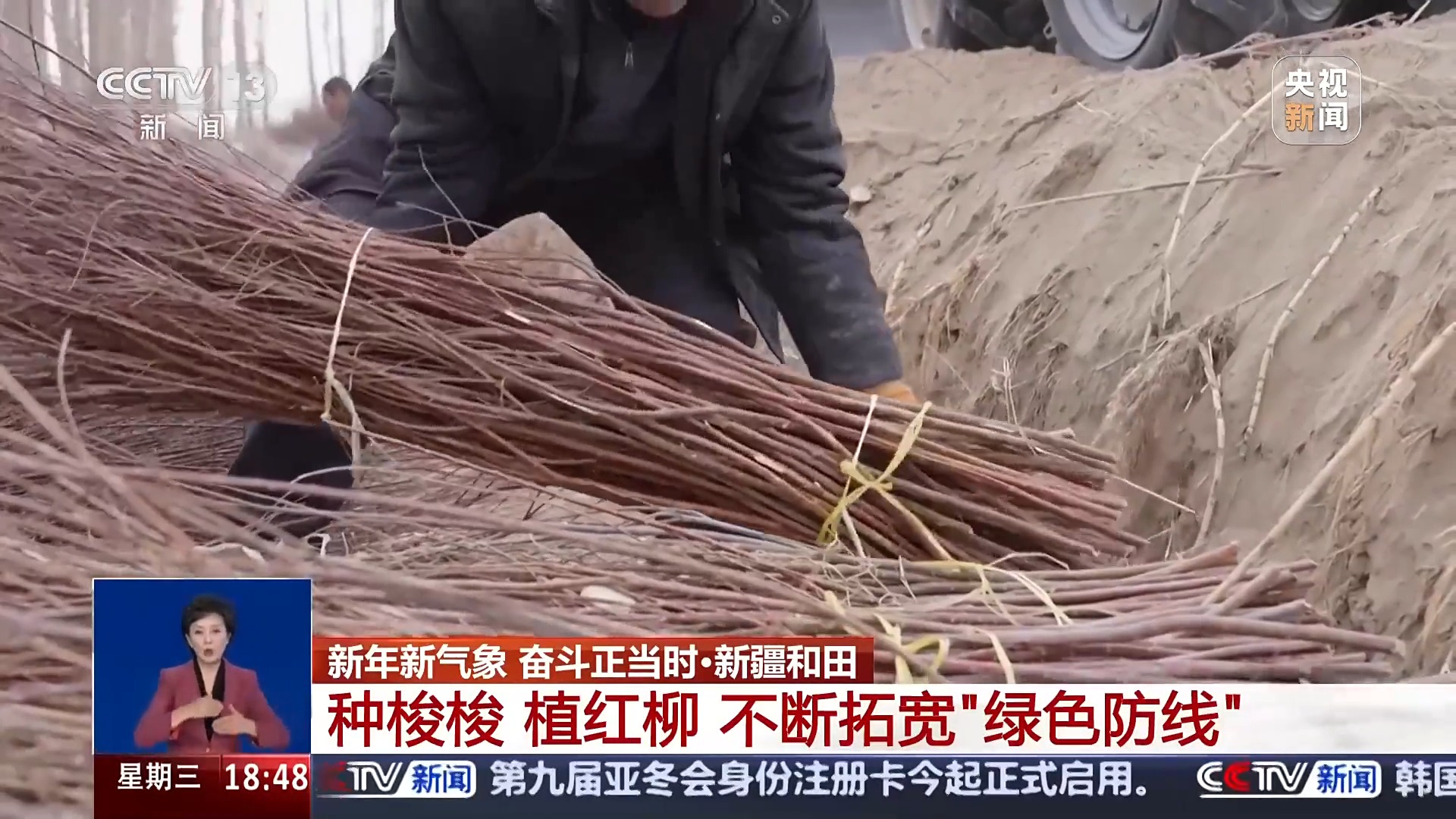 總臺(tái)記者 高鵬飛:這里是塔克拉瑪干沙漠南緣的和田于田縣,這兩天沙漠里面迎來了一場降雪,這會(huì)氣溫在零下10℃左右,非常寒冷,但是,在我旁邊就是一處熱火朝天的沙漠治沙現(xiàn)場。