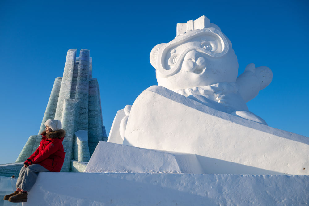 1月3日,在哈爾濱冰雪大世界園區(qū),游客與亞冬會吉祥物雪雕“濱濱”合影。