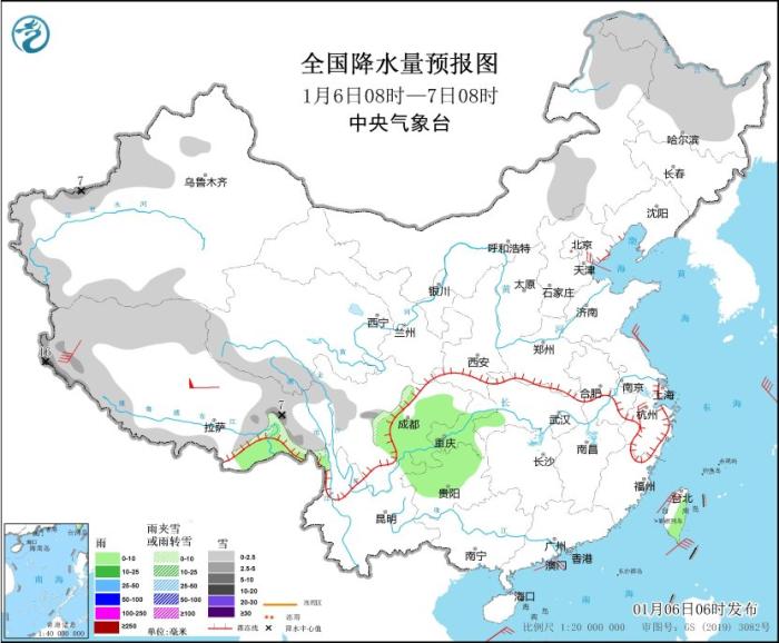 1月6日08時(shí)至7日08時(shí),內(nèi)蒙古中東部、黑龍江大部、新疆伊犁河谷和南疆盆地、西藏西部和東部、青海南部、川西高原北部、山東半島北部等地部分地區(qū)有小到中雪或雨夾雪,其中,新疆南疆西部山區(qū)、西藏西部等地部分地區(qū)有大雪,局地暴雪(10~16毫米)。西藏東南部、湖北西南部、重慶大部、貴州西北部、云南東北部、臺(tái)灣島東部等地部分地區(qū)有小雨。內(nèi)蒙古中東部、遼東半島、山東半島、浙江北部等地部分地區(qū)有4~6級(jí)風(fēng)(見圖1)。