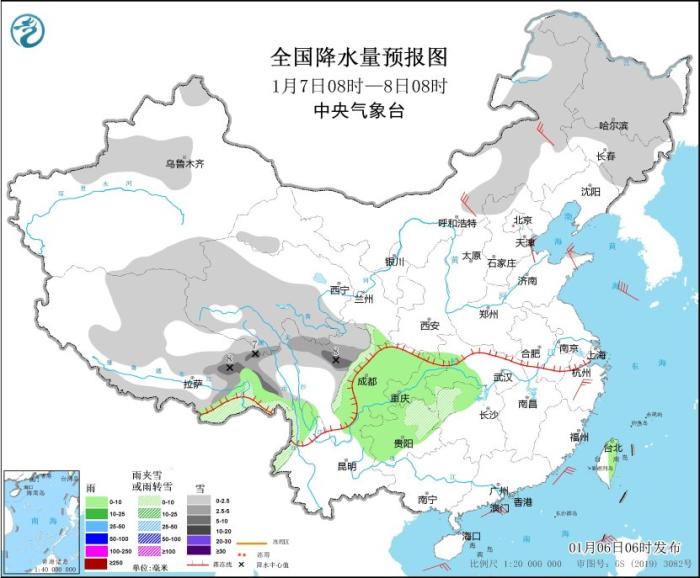 圖1 全國(guó)降水量預(yù)報(bào)圖(1月6日08時(shí)-7日08時(shí))