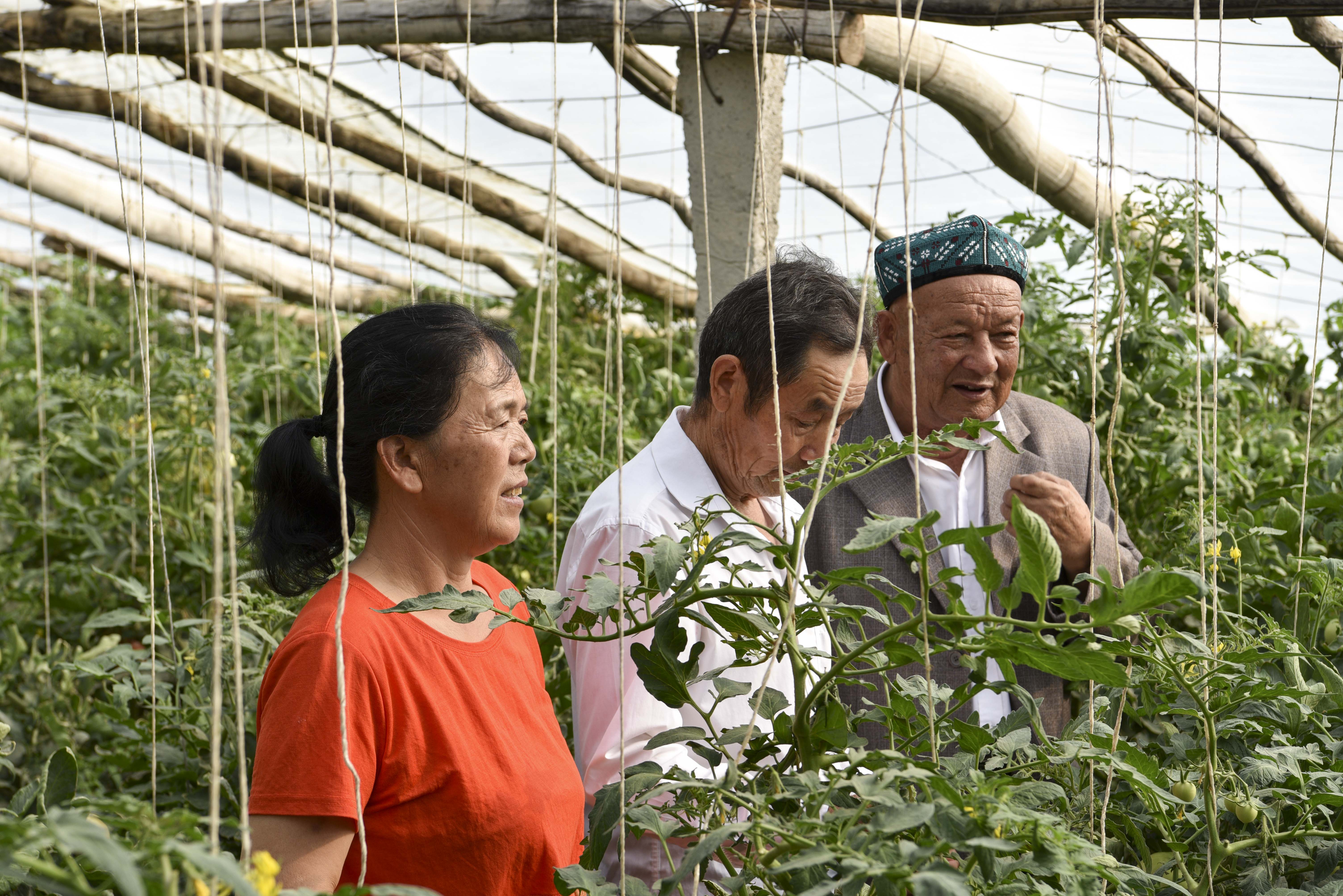 沙吾爾·芒力克(右一)和村民交流蔬菜種植經(jīng)驗(yàn)。白佳麗 攝