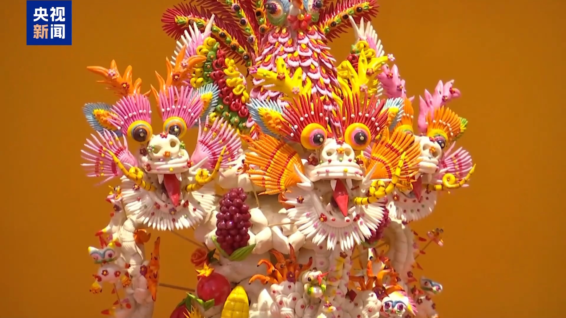由地方非遺傳承人制作,傳統(tǒng)與創(chuàng)新兼具的面花作品《龍鳳棗山》,用搓、揉、編等10多道工序結合制作而成,吸引了不少觀眾駐足觀看。