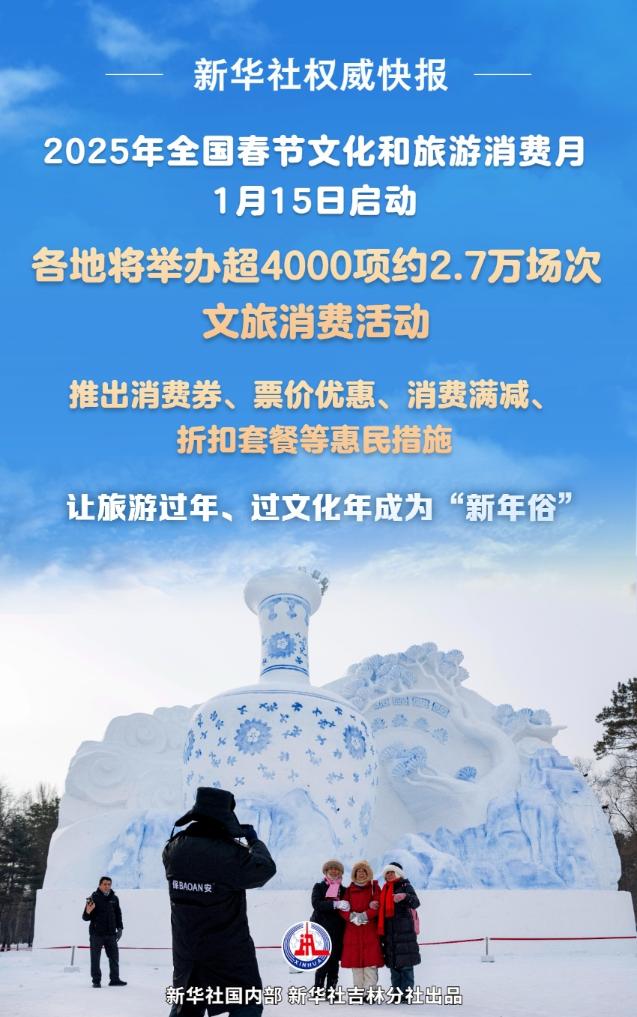 春節(jié)消費月期間,各地將結(jié)合冬季及春節(jié)文化和旅游消費特點,圍繞過年民俗、美食、冰雪、避寒、康養(yǎng)、親子、研學、演藝、時尚、國潮等重點消費需求,舉辦超4000項約2.7萬場次文旅消費活動,推出消費券、票價優(yōu)惠、消費滿減、折扣套餐等惠民措施,帶來實惠便利的文旅體驗,營造歡樂祥和的節(jié)日氛圍,讓旅游過年、過文化年成為“新年俗”,為人民群眾春節(jié)假期美好生活賦能添彩。
