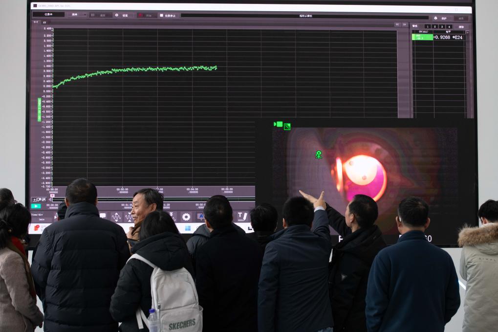2025年1月14日,在位于安徽省合肥市的聚變堆主機(jī)關(guān)鍵系統(tǒng)綜合研究設(shè)施(CRAFT)園區(qū)內(nèi),科研人員及專家通過大屏幕了解強(qiáng)流直線等離子體裝置“赤霄”的運(yùn)行狀態(tài)。新華社記者 張端 攝